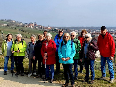 Nun geht es zum Bahnhof und mit der S-Bahn zurück nach Oppenheim. Der Wanderweg der Gruppe C ist ein Rundwanderweg durch die Weinberge bis Dienheim und zurück. Bei herrlicher Fernsicht über das Rhein-Main-Gebiet, das Ried ,zum Odenwald, hier legen wir eine Pause ein. Das wunderschöne Wanderwetter, die schönen Wege, spontan entscheiden wir, wir gehen den ganzen Weg und nehmen keine Bahn. Ein Zwischenstopp noch am Rathausplatz, dann gehen wir zur Fähre zurück.