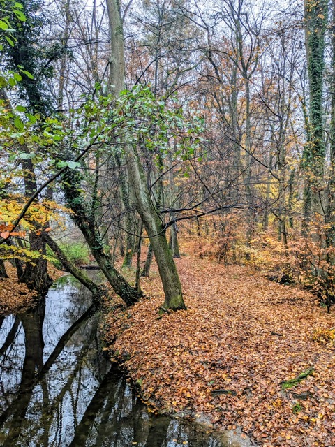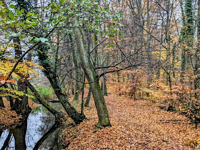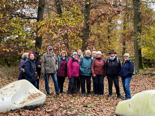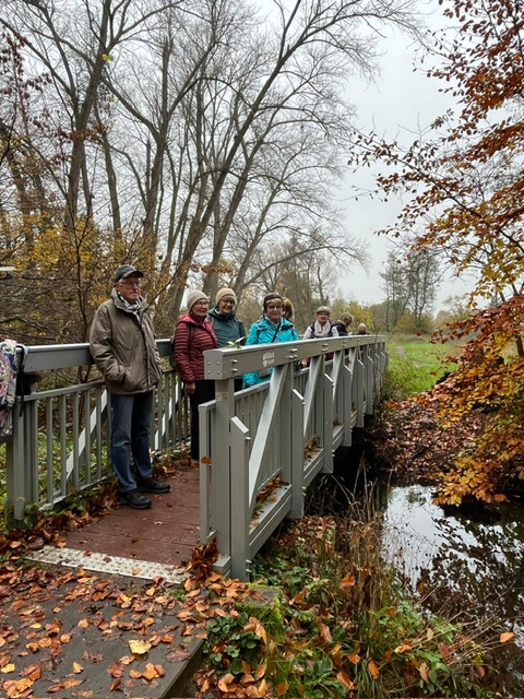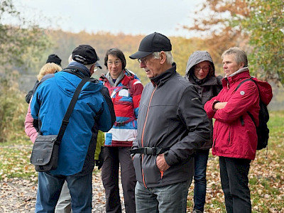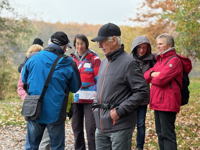 Auch trübes, regnerisches Novemberwetter hielt 33 Naturfreunde am 9. November 2025 nicht davon ab, sich am Naturfreundehaus Mörfelden zur fast letzten Tour des Jahres zu treffen.Gemeinsam starteten wir, vorbei am Campingplatz zu den „Sitzkieseln“, die an mehreren Orten im Regionalpark Rhein-Main zum Verweilen einladen, diesmal allerdings blieb das Sitzen eher theoretisch, denn die Kiesel waren nass und kalt. Weiter ging es über die Schnepfenschneise, an der ehemaligen Grillhütte vorbei entlang des Bornbruchsees. Dort trafen wir zwei unerschrockene Frauen, die trotz des Wetters noch ein Bad im See nahmen – Respekt! Hier trennte sich unsere Gruppe C mit dem Wanderführer Helmut Opper, um den See gemütlich zu umrunden. Die übrigen Gruppen wanderten weiter durch den herbstlichen Wald. Mit Laub bedeckte Wege und einige umgestürzte Bäume sorgten dafür, dass es trotz fehlender Steigungen nicht langweilig wurde. Danke an unseren Wanderführer Harald Altwig für die abwechslungsreiche Führung – auch flach kann schön sein, besonders im bunten Herbstwald. Entlang des Hegbachs ging es weiter über den Hegbachweg zur Altschlagschneise. Dort bog Gruppe B mit Wanderführerin Ursula Altwig Richtung Kalksandsteinwerk ab. Gruppe A nahm den Weg über Mittel- und Feldschneise ebenfalls dorthin und gelangte anschließend direkt zurück zum Naturfreundehaus.