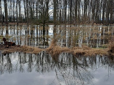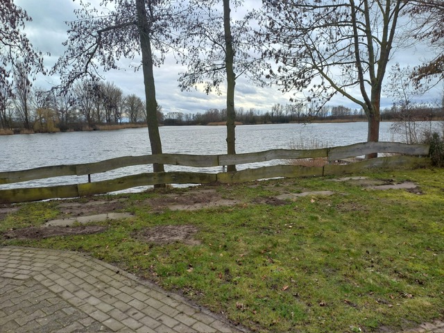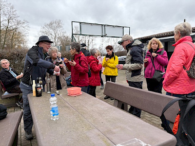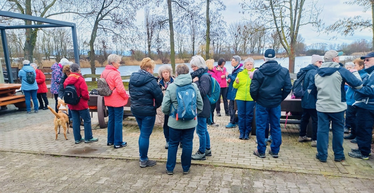 Die A-Gruppe lief voraus und plante ursprünglich, den Oberwiesensee zu umrunden. Aufgrund der starken Regenfälle der vergangenen Tage war dies jedoch nicht möglich. Stattdessen bot sich uns eine weitläufige Seenlandschaft, die ohne Gummistiefel kaum zu durchqueren gewesen wäre. So wanderten wir am linken Ufer des Nordsees entlang und legten eine kurze Pause am Oberwiesensee an der Gaststätte „Angler-Ruh“ des ASV Trebur ein – diese hatte allerdings noch nicht offiziell geöffnet.