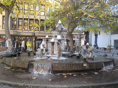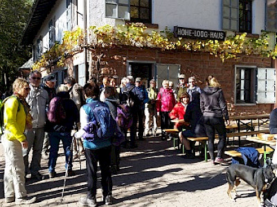 Nun war wirklich das Ziel erreicht, die Hohe-Loog-Hütte. Da wir an diesem Tag wunderbarstes Wanderwetter hatten, waren dummerweise noch viele andere Wanderer vor Ort. Zum Glück fand man einen Stapel Tische und Bänke, die ganz schnell aufgestellt wurden. So konnten alle zusammen die Wanderrast genießen. Der Rückweg war einfach. Es ging ca 2 Std. nur bergab nach Neustadt. Ein Bummel durch die Stadt mit seinen sehenswerten Brunnen führte die Wanderer zum Lokal. Leider ist es heutzutage kaum noch möglich, deutsche Lokale zu finden, die 60 Gäste nach 14 Uhr noch bewirten wollen. So war es auch hier. Statt Pfälzer Saumagen gab es Gyros und griechischen Wein. War aber auch gut.