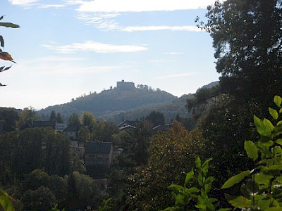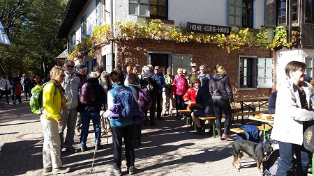 Die B-Gruppe , sie war mit 28 Wanderer um 2 Personen größer als die A- Gruppe, hatte auch einen ziemlich heftigen Aufstieg vor sich. Da die Strecke nur ca. 7 km betrug, konnten wir uns genügend Zeit nehmen. Am Deidesheimer Tempel wurde die erste Rast gemacht. Dann ging es weiter zur Wolfsburg, die bewirtschaftet war. Hier gab es auch eine alkoholische Stärkung eines Geburtstagskindes. Gemütlich ging es nun zurück zum Lokal.