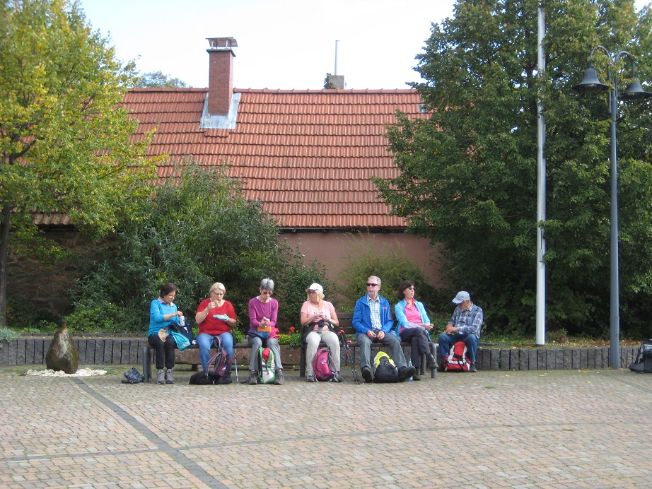 Am Rathausplatz in Kirchheim wurde eine Rast eingelegt. Die Wanderung ging dann über Bissersheim zum Ziel nach Großkarlbach.