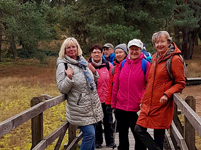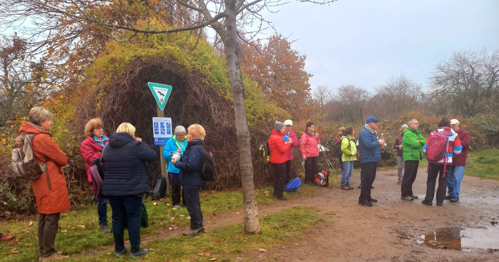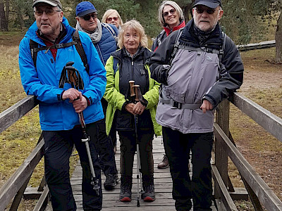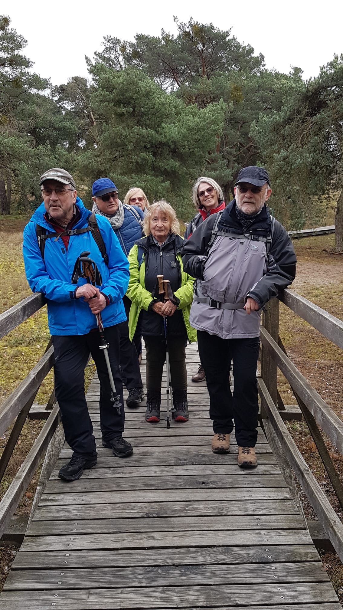 Die Schwanheimer Düne ist ein seit 1984 ausgewiesenes Naturschutzgebiet, Sand, Silbergras, Flechten und knorrige Kiefern prägen die Landschaft aber auch Streuobstwiesen. Ein idyllischer Ort, mit kurzen und langen Rundwegen. Wir legen nach dem Bohlenweg eine Pause ein und packen unsere mitgebrachten Snacks aus.