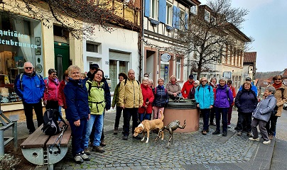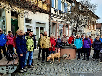 Unsere Wanderung beginnt an der Fähre Kornsand nach Oppenheim. Durch die Altstadt in Oppenheim „Stadt der Gotik und des Weines“; vorbei am Marktplatz und durch das Gautor, hier ist der erste Haltepunkt am Alten Amtsgericht. Von dort ist unser erstes Ziel der Gruppe A+B der Krötenbrunnen am Rheinterrassenweg der offiziell am 2014 eingeweiht wurde.