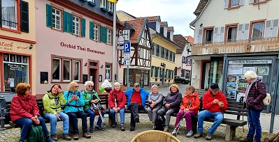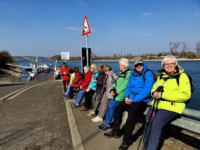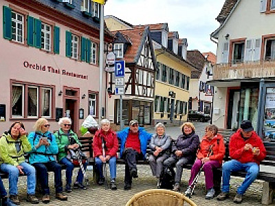 Nun geht es zum Bahnhof und mit der S-Bahn zurück nach Oppenheim. Der Wanderweg der Gruppe C ist ein Rundwanderweg durch die Weinberge bis Dienheim und zurück. Bei herrlicher Fernsicht über das Rhein-Main-Gebiet, das Ried ,zum Odenwald, hier legen wir eine Pause ein. Das wunderschöne Wanderwetter, die schönen Wege, spontan entscheiden wir, wir gehen den ganzen Weg und nehmen keine Bahn. Ein Zwischenstopp noch am Rathausplatz, dann gehen wir zur Fähre zurück.