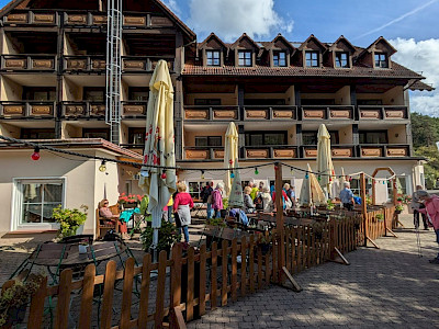 Gruppe A + B liefen zum Wasserschloss Mespelbrunn, um dann dem Anstieg auf den Spessart Räuberweg Nr. 3 zu folgen. Dort trennten sich auch die Wege. Gruppe A, die mit den Wanderwarten Harald Altwig und Johanna Nau weiter zum Staats-Trail, über die Eselshöhe wieder den Weg in Richtung Heimbuchenthal zur Abschluss-Einkehr “Zur Linde“ nahm. Gruppe B, angeführt von den Wanderwarten Ursula Altwig und Horst Nau, gehen von der Schutzhütte Zeugplatte dann fast direkt nach Heimbuchenthal zum Lokal „Zur Linde“. Bei der C-Gruppe hatte unser Helmut Opper seine Premiere als Wanderwart. Er führte seine Gruppe souverän in und durch den Kurpark zur Minigolfanlage und zurück „Zur Linde“. Alle waren begeistert. Die geplante Strecke der Gruppe A+B war eigentlich mit 8 KM und 11 KM gedacht, gelaufen wurden dann 10 KM und 13 KM. Auch bei Wanderwegen fehlt ab und an ein Hinweis oder sind nicht immer so ausgeschildert, wie man es sich wünscht, es wird ein Baum gefällt oder ein Weg durch Forstarbeiten verändert und schon ist die Strecke eine andere. Aber es war eine schöne Strecke und wir kamen alle frohgelaunt am Ziel an. Nachdem wir uns in der „Zur Linde“ bei köstlichen regionalen Spezialitäten aus dem Spessart und einem ausgesprochen freundlichen Service gestärkt hatten, traten wir gut gelaunt und zufrieden die Rückfahrt nach Büttelborn an – ein perfekter Abschluss für einen wunderschönen Wandertag im Räuberland.