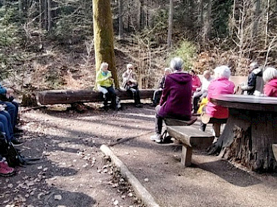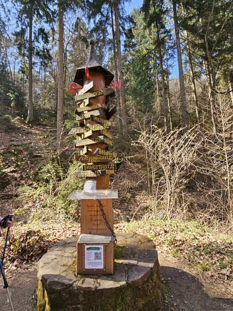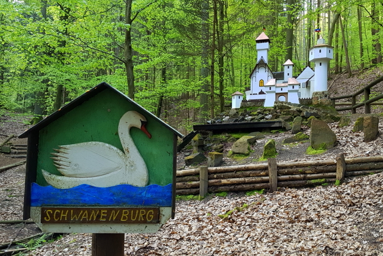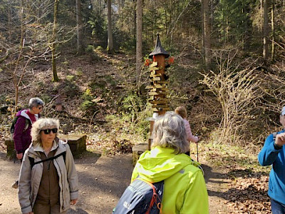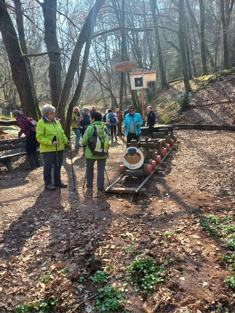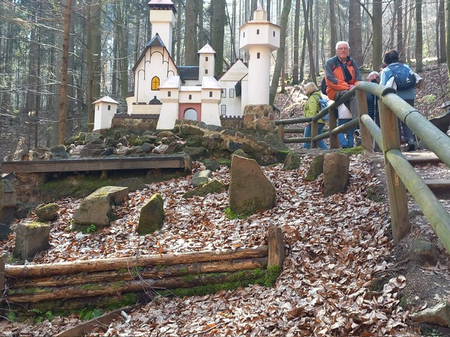 Unsere Wanderung begann für die Gruppen A und C in Mümling-Grumbach. Während Gruppe C entlang der Mümling über Höchst bis nach Hetschbach wanderte, führte der Weg von Gruppe A direkt in die Obrunnschlucht. Dort ging es in sanften Steigungen vorbei an liebevoll gestalteten Miniaturmodellen aus der Sagen- und Märchenwelt. Insgesamt wurden 14 kleine Brücken überquert, die seit 2019 von der Interessengemeinschaft erneuert werden. Über einige Stufen und gut begehbare Waldwege führte die Strecke weiter in Richtung Rimhorn.