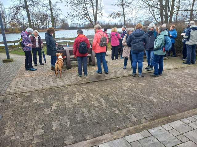 Die A-Gruppe lief voraus und plante ursprünglich, den Oberwiesensee zu umrunden. Aufgrund der starken Regenfälle der vergangenen Tage war dies jedoch nicht möglich. Stattdessen bot sich uns eine weitläufige Seenlandschaft, die ohne Gummistiefel kaum zu durchqueren gewesen wäre. So wanderten wir am linken Ufer des Nordsees entlang und legten eine kurze Pause am Oberwiesensee an der Gaststätte „Angler-Ruh“ des ASV Trebur ein – diese hatte allerdings noch nicht offiziell geöffnet.
